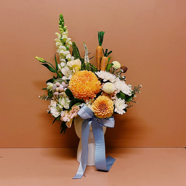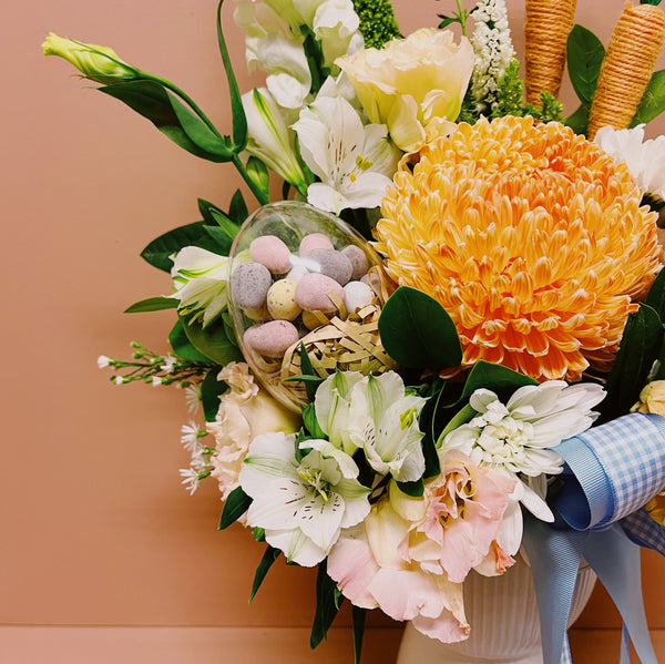 A mixture of gorgeous seasonal autumn blooms, (think fields that bunnies would hop through). Dahlia's, easter daisy , lisianthus just to name a few. Perfectly finished with a blue bow and a cheeky little easter egg surprise tucked beneath the flowers.. Cadbury mini eggs, feast your eye's!