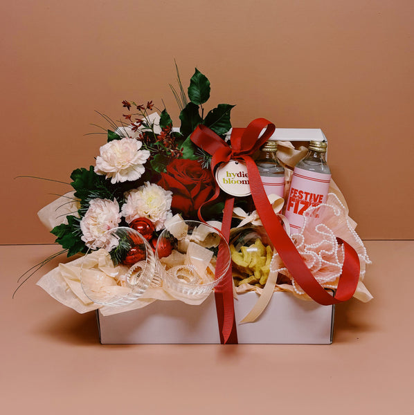 All wrapped up and ready to sleigh! Our Festive Fizz Gift Pack is the ultimate holiday treat — featuring 2 Monday Distillery Alcohol-Free Gins, 2 sparkling gin goblets, a delicious bauble of shortbreads from One Sweet Baker, sweet tulle accents, and our adorable “Rudolph’s Red Nose” floral arrangement. The perfect gift to spread some Christmas cheer! 🎄✨