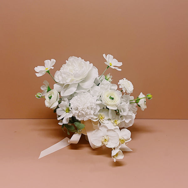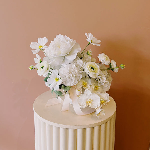 Displayed in a white footed ceramic pot and measuring approx 27H x 37W.