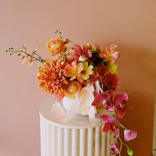 A 360 degree flower arrangement displayed in a white ceramic bowl pot