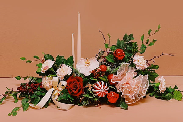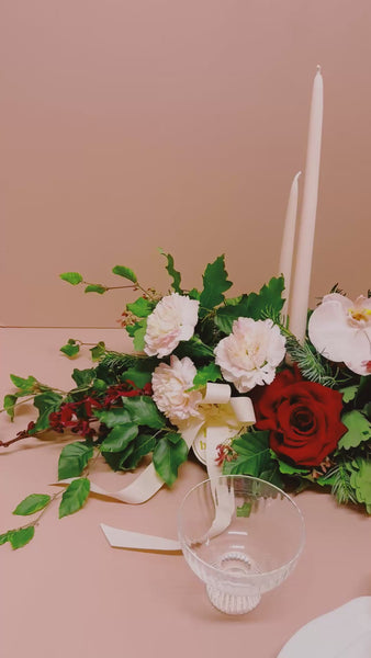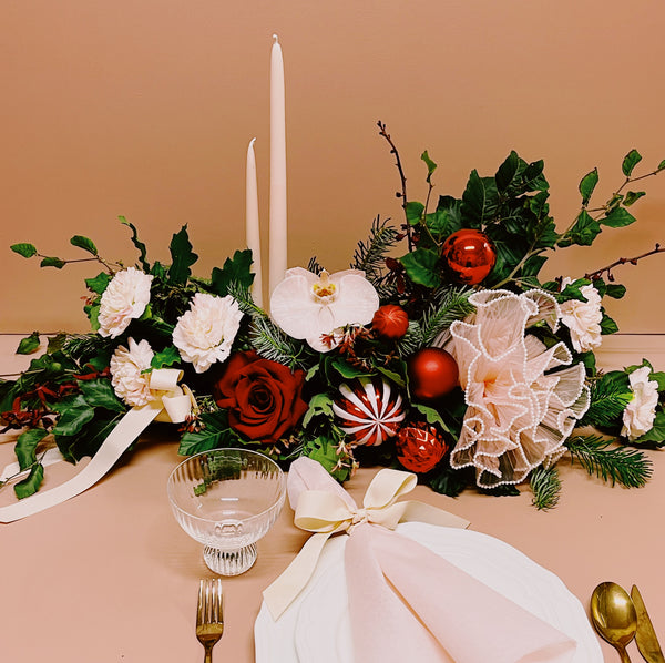 ‘The Night Before Christmas’ is our magical 2026 festive showstopper — the perfect centrepiece for your Christmas feast and available in two dazzling sizes! Brimming with premium Christmas blooms and lush foliage, it transforms any table into a holiday wonderland. Complete with elegant blush taper candles to set the mood and light up your Christmas night.